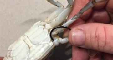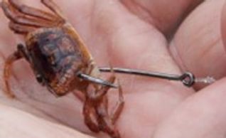 · For the larger crabs you will want to remove the legs and split them in halves or quarters, place the hook through a leg opening and bring it out through the bottom of the shell