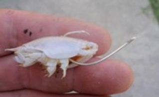 Hooking a Sand Flea is done from the under side and up through its shell.